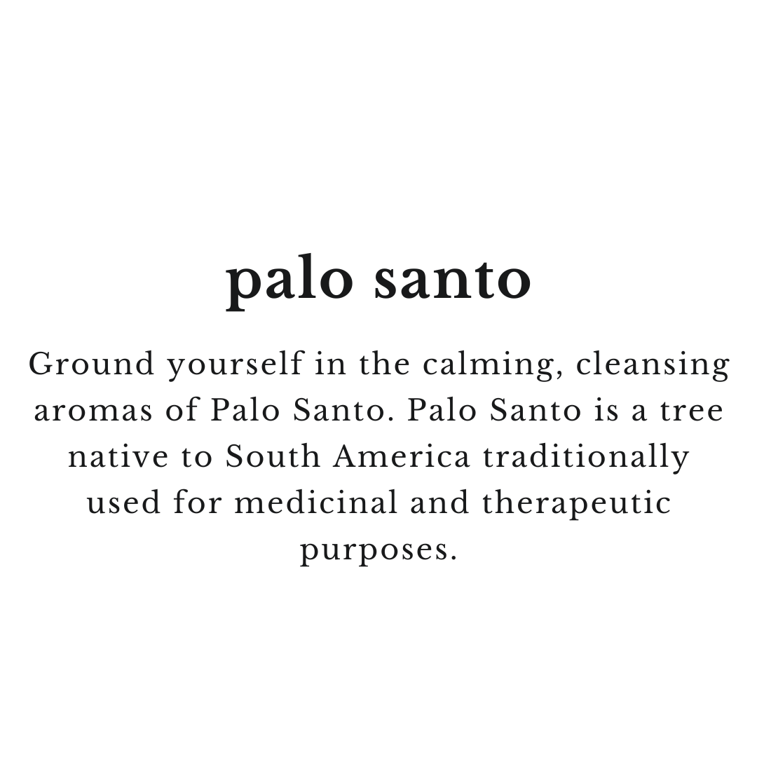 Ground yourself in the calming, cleansing aromas of Palo Santo. Palo Santo is a tree native to South America traditionally used for medicinal and therapeutic purposes. It’s also said to have properties that clear negative energy and promote well-being. This trendy, highly requested scent captures the clean woodiness of palo santo.