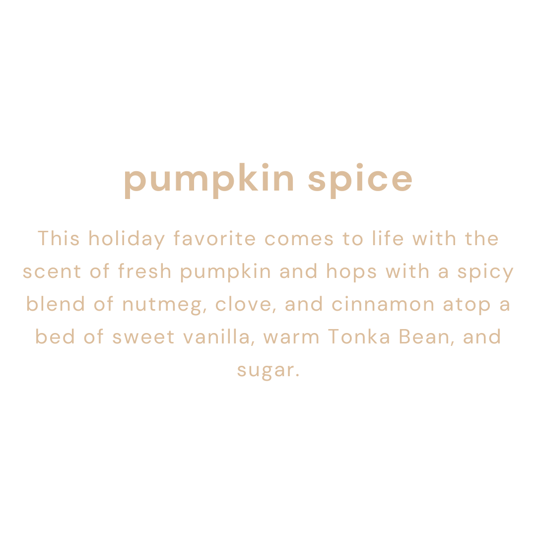 This holiday favorite comes to life with the scent of fresh pumpkin and hops with a spicy blend of nutmeg, clove, and cinnamon atop a bed of sweet vanilla, warm Tonka Bean, and sugar.