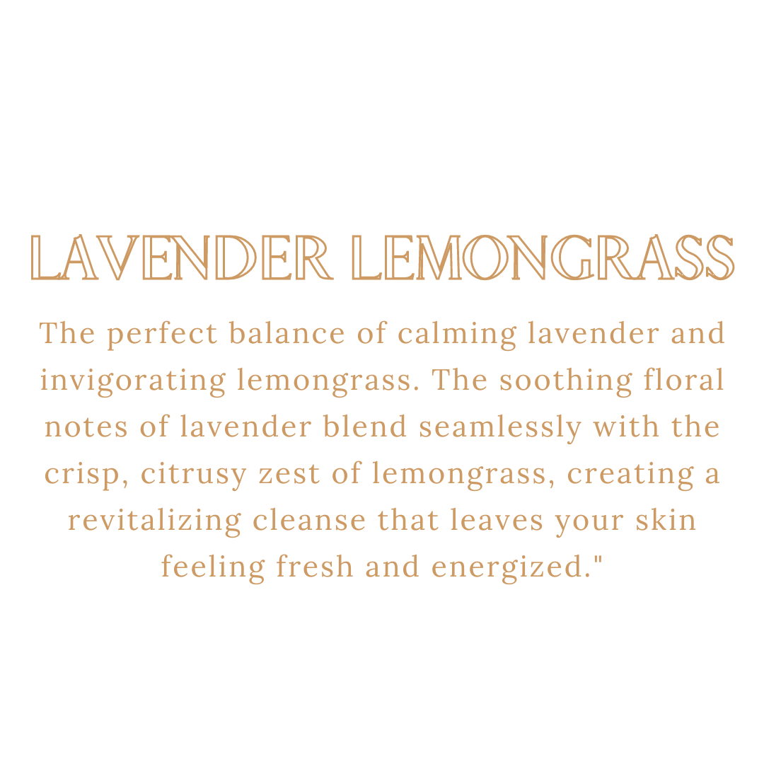 The perfect balance of calming lavender and invigorating lemongrass. The soothing floral notes of lavender blend seamlessly with the crisp, citrusy zest of lemongrass, creating a revitalizing cleanse that leaves your skin feeling fresh and energized."
