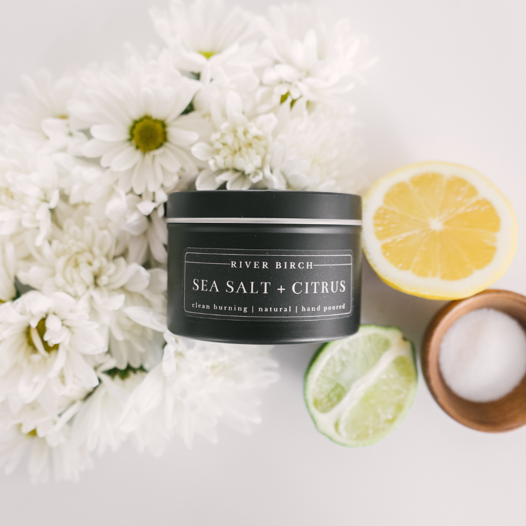 Our Sea Salt + Citrus evokes the churn of the sea, wrapping the water, sand, and salt together into a clean and ozonic scent. Top notes of lemon, orange, and fresh ozone give way to a heart of briny sea salt and a hint of jasmine. Light musk balances the woody violet and cedar in the base.