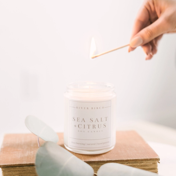Our Sea Salt + Citrus evokes the churn of the sea, wrapping the water, sand, and salt together into a clean and ozonic scent. Top notes of lemon, orange, and fresh ozone give way to a heart of briny sea salt and a hint of jasmine. Light musk balances the woody violet and cedar in the base.