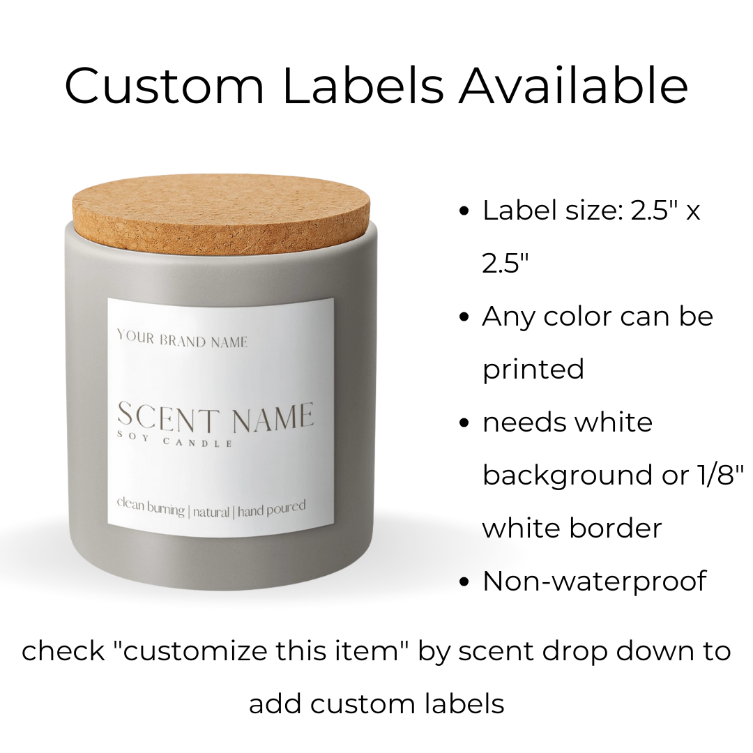 Option 1 - We print a label design you provide. Label size varies with the vessel Option 2 - We add your brand name/fonts and colors to our label design Option 3 - We fully design labels ($100 one-time design fee will apply) Please reply to order confirmation with which option you would like if you select "Custom Labels"